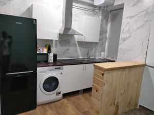 Accommodation consists of one bedroom featuring two beds along with a fully equipped kitchen that includes a stovetop, refrigerator, microwave, coffee machine, dining table as well as kitchenware for meal preparation. The apartment also provides a washing machine for guest convenience and additional room amenities such as tile or marble flooring, towels, bed linen, heating facilities, clothes drying rack and a baby cot or crib plus sofa seating.