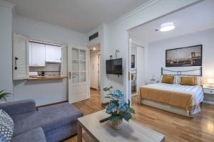 Das klimatisierte Apartment besteht aus einem Schlafzimmer mit einem Bett, einem Bad mit ebenerdiger Dusche und Haartrockner sowie Parkettboden im gesamten Bereich. Die voll ausgestattete Küche verfügt über Backofen, Herdplatte, Geschirrspüler, Kühlschrank, Kaffeemaschine und Mikrowelle sowie sämtliches notwendiges Kochgeschirr. Weitere Ausstattungsmerkmale des Apartments umfassen Waschmaschine, Bügeleisen, Kleiderschrank oder Schrank, Sitzecke mit Flachbildfernseher sowie Handtücher und Bettwäsche.