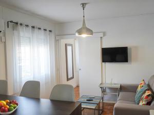 The apartment features one bedroom with a sofa bed and wardrobe. The fully equipped kitchenette includes an electric kettle, microwave, toaster, kitchenware, full kitchen facilities, and a coffee machine for meal preparation. There is a seating area with a flat-screen TV as well as heating and air conditioning. Additional conveniences include an iron, clothes drying rack, towels, bed linen and washing machine.