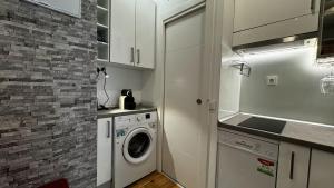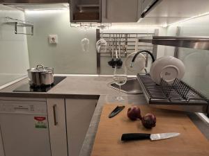 The apartment features a living room alongside the bedroom and offers full kitchen amenities including kitchenware, microwave, oven, stovetop, refrigerator, dishwasher as well as a coffee machine and dining table for convenient meal preparation. In-room comforts include individually controlled air conditioning for the room, heating facilities, an iron with ironing board, washing machine, sofa bed with additional sofa seating options along with bed linen and towels provided.