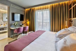 Las habitaciones disponen de camas king size o camas dobles individuales, aire acondicionado, televisores planos con canales vía satélite y escritorios para trabajar. Cada alojamiento incluye baño privado equipado con batas, zapatillas, secadores—y planchas profesionales GHD bajo petición—además de artículos gratuitos para aseo personal. Algunas estancias más amplias cuentan con terrazas o balcones privados que ofrecen vistas panorámicas o al calle López de Hoyos.