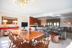 Accommodation consists of seven separate bedrooms and five bathrooms equipped with walk-in showers, bathtubs, bidets, complimentary toiletries including shampoo and conditioner, plus in-room saunas and spa baths. The living room features a fireplace alongside satellite flat-screen TV channels. A fully equipped kitchen offers an oven, dishwasher, microwave, coffee machine, toaster as well as kitchenware and dining facilities including a high chair for children.