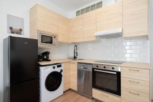 This apartment features one bedroom with two beds alongside a fully equipped kitchen suitable for cooking and storing food supplies as well as one bathroom for guest convenience. Room amenities include air conditioning for comfort during warmer months, a washing machine for laundry needs, and a flat-screen TV to enjoy entertainment.