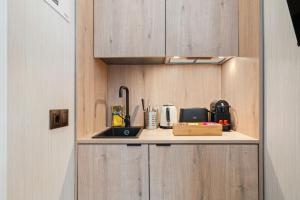 Each room features one bed along with air conditioning and a sofa for relaxation. Guests can prepare meals using kitchen amenities such as a coffee machine, toaster, electric kettle, microwave, refrigerator, and essential kitchenware found in every unit. Bathrooms are equipped with walk-in showers without steps or standard showers depending on the unit type alongside hairdryers and complimentary toiletries like shampoo and body soap.