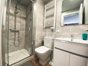 The apartment comprises two separate bedrooms with three beds in total, along with two bathrooms fitted with showers and hairdryers. The living area features a TV with satellite channels, while the kitchen contains a refrigerator, dishwasher, oven, toaster, microwave, coffee machine and full kitchenware essentials. Additional room amenities include air conditioning, heating, towels and bed linen as well as ironing facilities including an iron and ironing board.