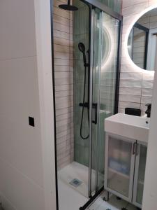 Inside the apartment you will find one separate bedroom with parquet flooring and bed linen provided. The bathroom includes both a shower and hairdryer for guest convenience. The living room features a seating area with a flat-screen TV as well as bedside sockets for easy charging.