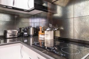 Accommodation comprises one living room, three separate bedrooms, and one bathroom fitted with a shower and hairdryer. The fully equipped kitchen features a stovetop, refrigerator, dishwasher, oven, toaster, electric kettle, coffee machine as well as complete kitchenware forming a kitchenette area. Additional in-room amenities include air conditioning, heating, wardrobe/closet space, seating area with sofa and flat-screen TV along with work desk facilities.