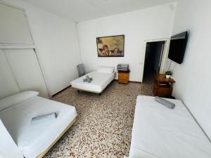 The accommodation includes rooms with one to three beds, some offering private bathrooms equipped with showers or bathtubs. Each room features modern comforts such as flat-screen TVs, synthetic non-feather pillows, heating or air conditioning depending on the unit, work desks, clothes drying racks, towels, bed linens on tile or marble flooring.