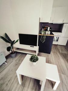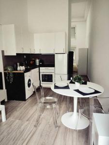 Accommodation comprises one bedroom and a separate living room featuring two beds including a sofa bed for added flexibility. The fully equipped kitchen includes an oven, microwave, refrigerator, toaster, coffee machine and all necessary kitchenware alongside a dining table for comfortable meals indoors.