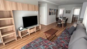 The accommodation comprises two separate bedrooms, a living room with a sofa seating area, and one bathroom equipped with a bathtub, bidet, hairdryer, complimentary toiletries including body soap. The fully equipped kitchen features a refrigerator, dishwasher, microwave, toaster, coffee machine, electric kettle as well as kitchenware for self-catering needs. Additional room amenities include air conditioning heating facilities iron with ironing board clothes drying rack wardrobe closet non-feather pillows towels bed linens washing machine bedside sockets flat-screen TV and synthetic pillow options.